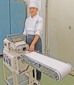たとえば手で行なうと、均一にするのが難しかったり、気泡が入ったりしますが、それがないですし、手仕事だと時間がかかる分割が、きれいに早く仕上がるんです」と、総製菓長である津崎泰男常務は話す。